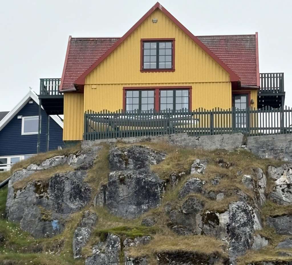 This house is one of the few original houses made of imported wood in the early 1800s. Painted in primary colors, houses like these are picture postcard perfect and are the ones you will see in advertisements for visiting Nuuk. Since no trees grow on the island, wood is extremely expensive and has been forbidden to import for over a century. Other than mosses, nothing grows here. No flowers, no vegetables, no fruits, no livestock other than undomesticated animals like reindeer. Seals are in abundance, as is arctic char. People in small villages get Vitamin C from seaweed and eating certain parts of seal meat. Today, virtually everything is imported.
