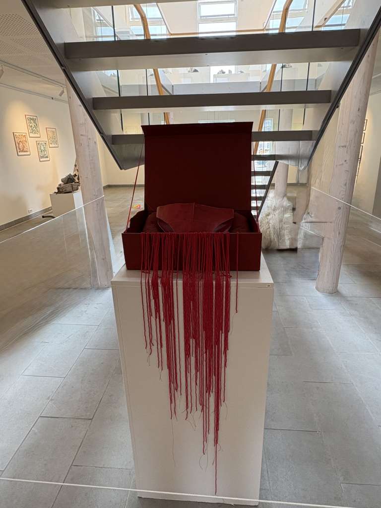 This sculpture broke my heart. I arrived in Nuuk a day after the Danish Prime Minister made a formal apology to the Inuit population in Greenland for involuntarily sterilizing young Inuit women and girls so they could not bear children, thus limiting the number of Inuit citizens the Danish government was responsible for. The suitcase, representing the Danish government, and the female reproductive organs inside it are made of dyed sealskin. The 43,000 beads, dripping down the pedestal represent the estimated unborn Inuit babies. Beading decorates all Inuit clothing, from hats to shoes.