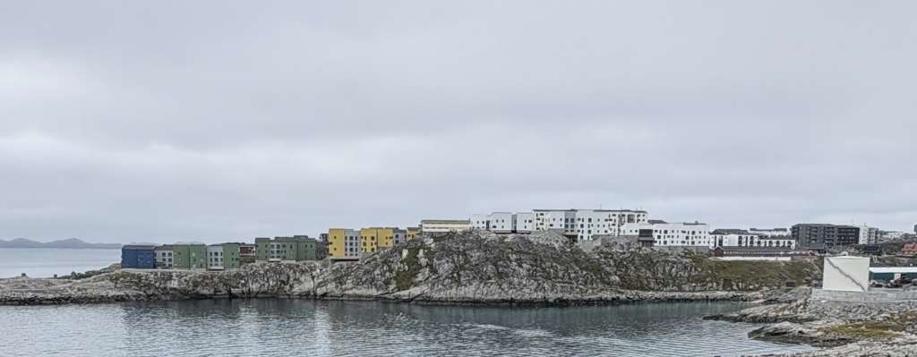 Except for the smattering of older primary colored wood houses, Nuuk looks mostly like this: Soviet era housing of stacked boxcars and concrete block apartments. This type of building may not be painted in primary colors. Since the ground is either solid rock or ice, electricity, water and sewer pipes cannot be buried so lie strewn across the rocks near the water’s edge. The climate is inhospitable year round. The brief summer months have sunshine and warmer days but biting black flies, requiring wearing netting since they are immune to the usual insect repellants. Fog is ubiquitous and some form of precipitation is expected daily.